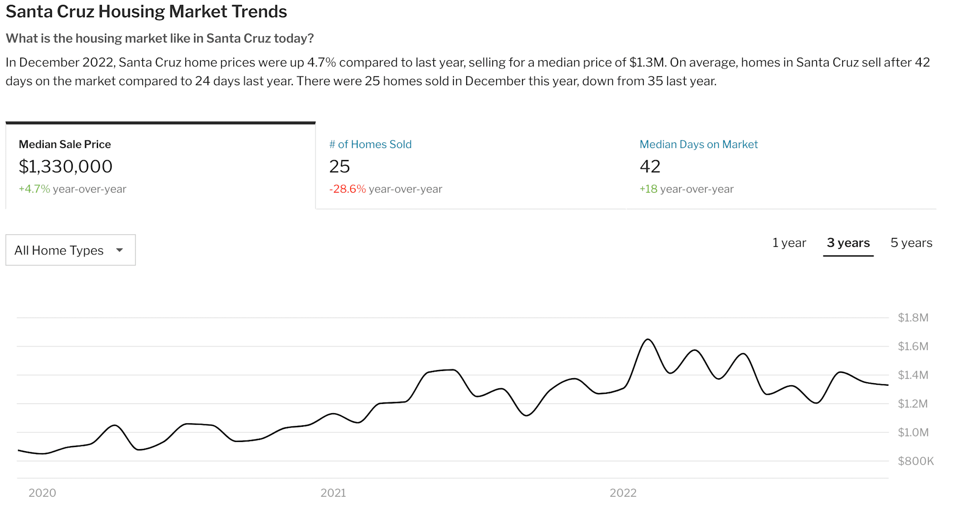 The Santa Cruz housing market is very competitive. The average sale price of a home in Santa Cruz was $1.34M last month, up 2.9% since last year. The average sale price per square foot in Santa Cruz is $828, down 13.3% since last year.