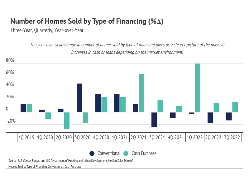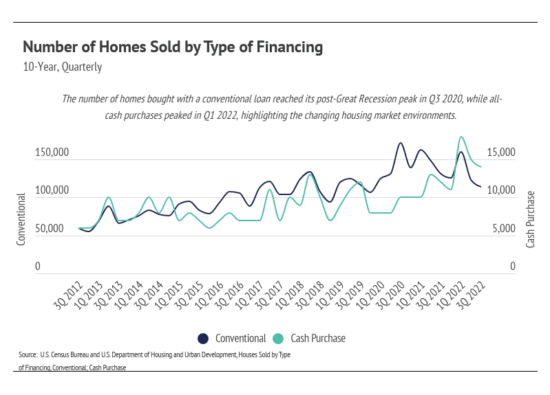 Buyers acted in their financial interest remarkably well between 2020 and 2022, evidenced by the type of financing buyers used to purchase homes during that period. The average 30-year mortgage rate reached record lows in the third quarter of 2020, dipping below 3% for the first time ever. The super-low cost to borrow priced more potential buyers into the market because of the massive increase in affordability. For example, if you can afford the monthly payments on a $500,000 loan at 6% (~$3,000/month), then you can afford a $700,000 loan at 3% (~$3,000/month). Homebuyers, in a sense, could afford more home, so conventional loans rose to the highest level since 2006, and prices rose at the fastest rate in history. Importantly, prices rose quickly, but buyers weren’t getting priced out of the market because of the outsized effect interest rates have on affordability. Financing through conventional loans remained elevated through Q1 2022, which marked a sharp increase in mortgage rates and inflation.