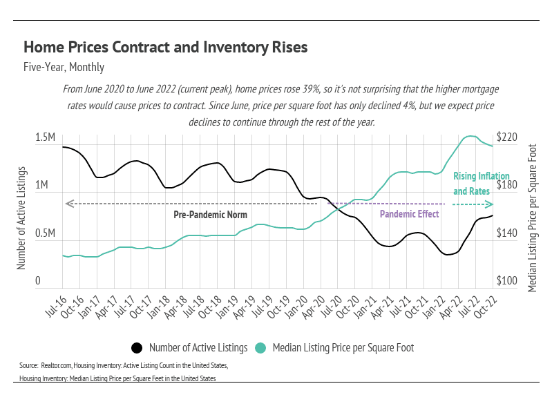 Competition for homes typically softens during the winter months because people focus on the holidays and tend to be less active because of the colder weather and shorter daylight hours. Add in 15- to 20-year-high mortgage rates, prices still near record highs, high inflation, and worries over a recession, and let’s say the competition over homes tends to decline further. This year, sales have dropped every month since January according to the National Association of Realtors, a 32% drop overall. If this trend continues through the rest of the year (current data ends October 2022), which it almost certainly will, 2022 will have about a million fewer sales than 2021. Of course, 2021 had the largest number of sales since 2006, with nearly a million homes sold above the long-term average. With that in mind, it stands to reason that about a million fewer homebuyers than average would be in the market in 2022, especially when considering that financial incentives to buy ended abruptly at the start of this year. We were still surprised to see inventory rise in October after inventory appeared to peak in September.